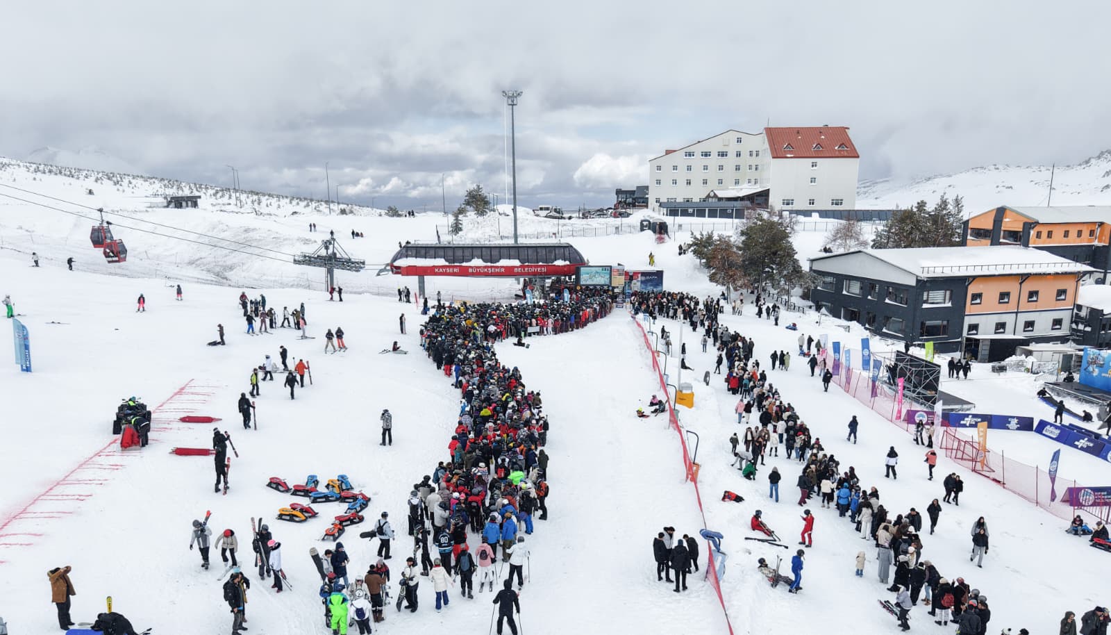 İç Anadolu’nun en yüksek noktası olan 3 bin 917 metre rakımlı Erciyes Dağı’ndaki merkez; farklı zorluk derecelerine sahip pistleri, suni karlama sistemi, snowboard ve kızak alanlarıyla her sezon binlerce yerli ve yabancı turisti ağırlıyor. Aileleriyle birlikte gelen vatandaşlar özellikle kızak alanlarında yoğunluk oluştururken, oluşan kalabalık dron ile havadan görüntülendi.