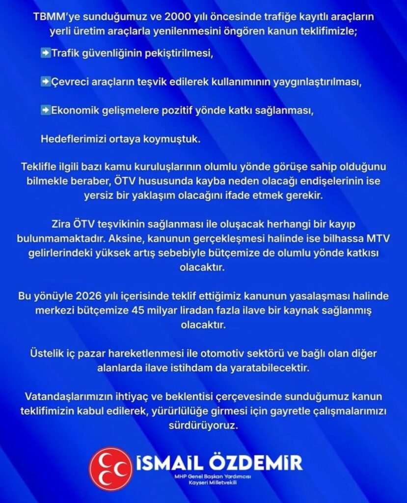 Özdemir, sosyal medya hesabından yaptığı paylaşımda, “TBMM’ye sunduğumuz ve 2000 yılı öncesinde trafiğe kayıtlı araçların yerli üretim araçlarla yenilenmesini öngören kanun teklifimizle trafik güvenliğinin pekiştirilmesi, çevreci araçların teşvik edilerek kullanımının yaygınlaştırılması, ekonomik gelişmelere pozitif yönde katkı sağlanması hedeflerimizi ortaya koymuştuk. Teklifle ilgili bazı kamu kuruluşlarının olumlu yönde görüşe sahip olduğunu bilmekle beraber, ÖTV hususunda kayba neden olacağı endişelerinin ise yersiz bir yaklaşım olacağını ifade etmek gerekir. Zira ÖTV teşvikinin sağlanması ile oluşacak herhangi bir kayıp bulunmamaktadır. Aksine, kanunun gerçekleşmesi halinde ise bilhassa MTV gelirlerindeki yüksek artış sebebiyle bütçemize de olumlu yönde katkısı olacaktır. Bu yönüyle 2026 yılı içerisinde teklif ettiğimiz kanunun yasalaşması halinde merkezi bütçemize 45 milyar liradan fazla ilave bir kaynak sağlanmış olacaktır. Üstelik iç pazar hareketlenmesi ile otomotiv sektörü ve bağlı olan diğer alanlarda ilave istihdam da oluşturabilecektir. Vatandaşlarımızın ihtiyaç ve beklentisi çerçevesinde sunduğumuz kanun teklifimizin kabul edilerek, yürürlülüğe girmesi için gayretle çalışmalarımızı sürdürüyoruz” ifadelerini kullandı.