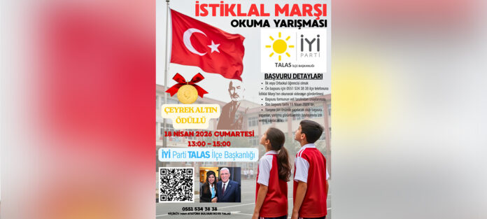 İYİ Parti Talas İlçe Başkanlığı’ndan yapılan açıklamada, İstiklal Marşı’nın milli egemenliğin en önemli sembollerinden biri olduğu vurgulanarak, yarışmaya başvuruların başladığı bildirildi. Yarışmada jüri değerlendirmesi sonucunda birinci olan öğrenciye çeyrek altın ödülü verileceği ifade edildi. Yarışmaya ilkokul ve ortaokul öğrencilerinin katılabileceği belirtilirken, başvuruların İstiklal Marşı’nın okunduğu video kaydının 0551 534 38 38 numaraya WhatsApp üzerinden gönderilmesiyle yapılacağı kaydedildi. Ayrıca başvuru formunun veliler tarafından onaylanmasının zorunlu olduğu aktarıldı. Son başvuru tarihinin 15 Nisan 2026 Çarşamba günü olduğu yarışmada, başvuru yapan katılımcıların yarışmaya ait görsellerin sosyal medyada paylaşılmasına izin vermiş sayılacağı belirtildi. Tüm halka açık olarak düzenlenen yarışmada herhangi bir üyelik şartı aranmadığı bildirildi. Yarışmaya katılacak öğrencilere başarı dileğinde bulunuldu. Haber Merkezi