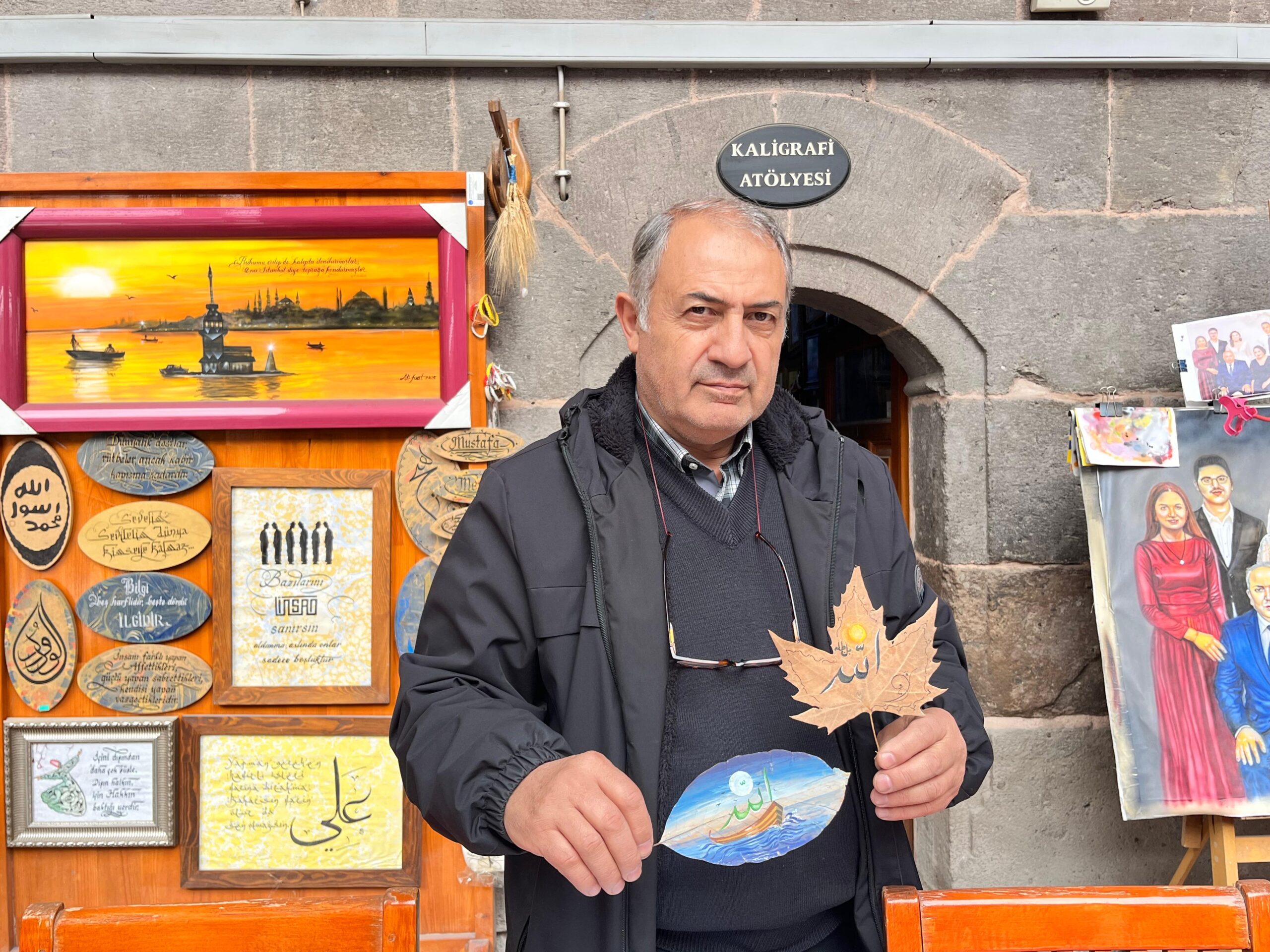 Hunat Hatun Medresesi’nde işletmesi bulunan kaligrafi sanatçısı Osman Durmuş, 25 yılı aşkın süredir kaligrafi sanatıyla ilgileniyor. Durmuş son dönemde özellikle mürekkeple kaligrafi sanatını kurumuş yapraklara işliyor. Yıllardır kaligrafi sanatıyla uğraştığını belirten Durmuş, “Yaklaşık 25 yıldır kaligrafi sanatıyla ilgileniyorum. Kaligrafi, yabancı kökenli bir kelime olduğu için grafik ve kallos kelimelerinin birleşmesiyle meydana gelmiştir. Grafik, çizgi anlamında; kallos ise güzel yazı, güzel çizgi anlamına gelmektedir. Yani kısacası güzel yazı demektir. Önceden elle işleniyordu. Elle işlendiği için sanatsal oluyordu ve bu da zamanla bir sanat dalına dönüşmüş. Bunu yaparken en çok klasik olarak bizim bildiğimiz kesik uçlu kalemleri kullanıyoruz. Kesik uçlu kalem, bizim kendi kültürümüze ve geleneklerimize ait bir kalemdir. Bana gelen insanlar yeni şeyler üretilmesi talebinde bulunuyor. Mesela en öncelikli olarak ben yapraklara daha çok ilgi duyuyorum, yaprakları seviyorum. Yani klasik kağıtlardan ziyade yaprak ve ahşap gibi farklı materyallere yazı yazmayı tercih ediyorum. Genelde kaligrafi sanatında fon olarak ebru kullanıyoruz. Ebru ile uğraşanlar bunu daha iyi bilir. Ben de bunu fon olarak kullanıyorum” diye konuştu.