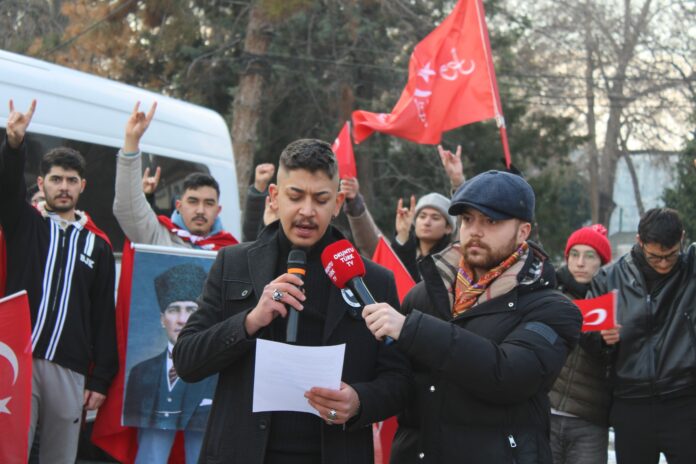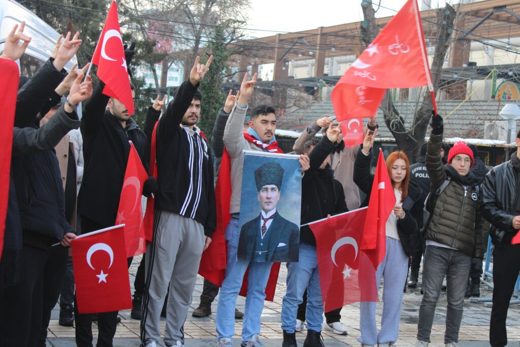 Cumhuriyet Meydanı’nda toplanan dernek üyeleri ve vatandaşlar; Türk Bayrağı’na yapılan saldırıya tepki gösterdi. Burada açıklama yapan Dernek Başkanı Efe Emir Dalklıç; bayrağa yapılan saldırının Türk Milleti’nin birliğine yapıldığını ifade ederek; “Türk Bayrağı yalnızca bir devlet sembolü değil, Adriyatik’ten Çin Seddi’ne uzanan Türk Dünyası’nın ortak tarih, onuru ve istiklal iradesidir. Bayrağın yere indirilmesi bir devlete değil Türk Milleti’nin birliğine ve binlerce yıllık devlet geleneğine yapılmış açık bir saldırıdır. Bu alçak provokasyon Türk’ün yükselişinden rahatsız olan zihniyetlerin eseridir. Bayrağı hedef alanlar bilmelidir ki Türk Bayrağı, tüm Türk yurtlarının ortak namusudur. Yüce Türk Milleti olarak tespit edilen faillerin en ağır şekilde cezalandırılmasını ve bu tür saldırılara asla müsamaha gösterilmeyeceğinin açıkça ilan edilmesini talep ediyoruz” dedi.