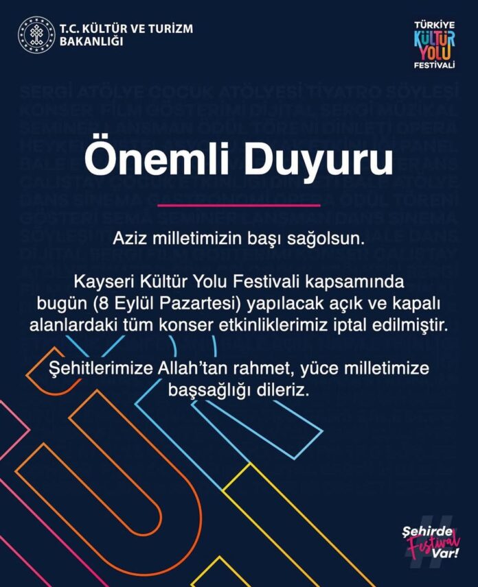 Festival komitesi tarafından konuyla ilgili olarak yapılan açıklamada; “Aziz milletimizin başı sağ olsun. Kayseri Kültür Yolu Festivali kapsamında bugün yapılacak tüm konser etkinliklerimiz iptal edilmiştir. Şehitlerimize Allah’tan rahmet, yüce milletimize bağ sağlığı dileriz” denildi.