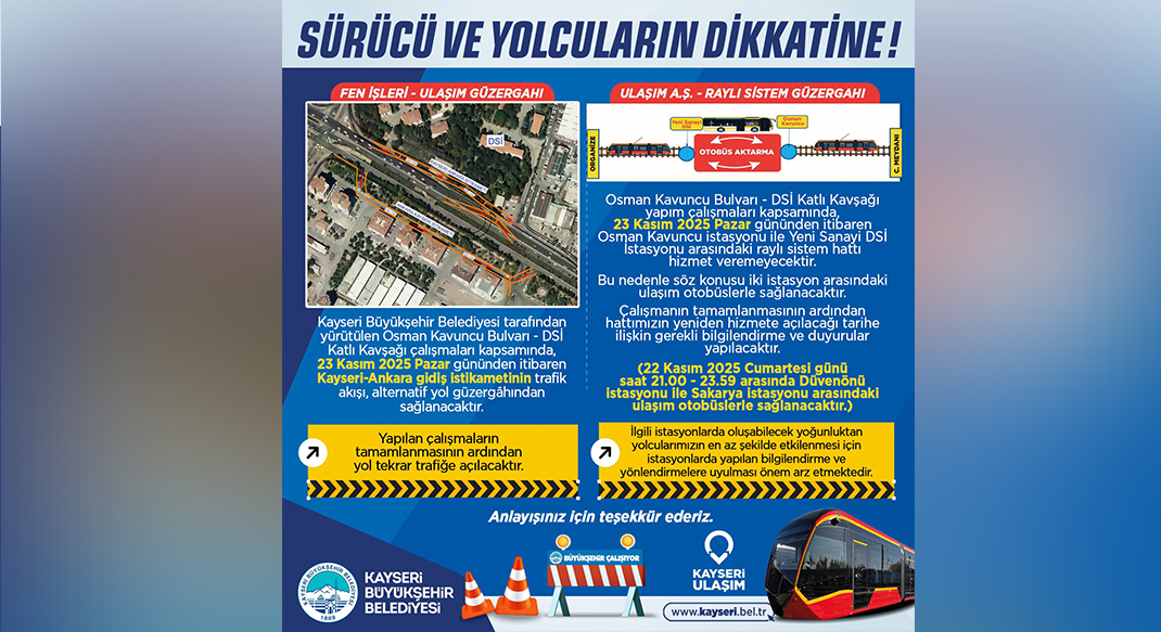 Ayrıca, 23 Kasım’dan itibaren Osman Kavuncu İstasyonu ile Yeni Sanayi DSİ İstasyonu arasındaki raylı sistem hattı yapım çalışmaları nedeniyle geçici olarak kapatılacak. Bu hatta yolcuların mağdur olmaması için ulaşım süre boyunca otobüslerle sağlanacak. İlgili istasyonlarda gerekli bilgilendirmeler yapılarak yolcular titizlikle yönlendirilecek. Hattın hizmete yeniden açılacağı tarih kamuoyuna ayrıca duyurulacak.