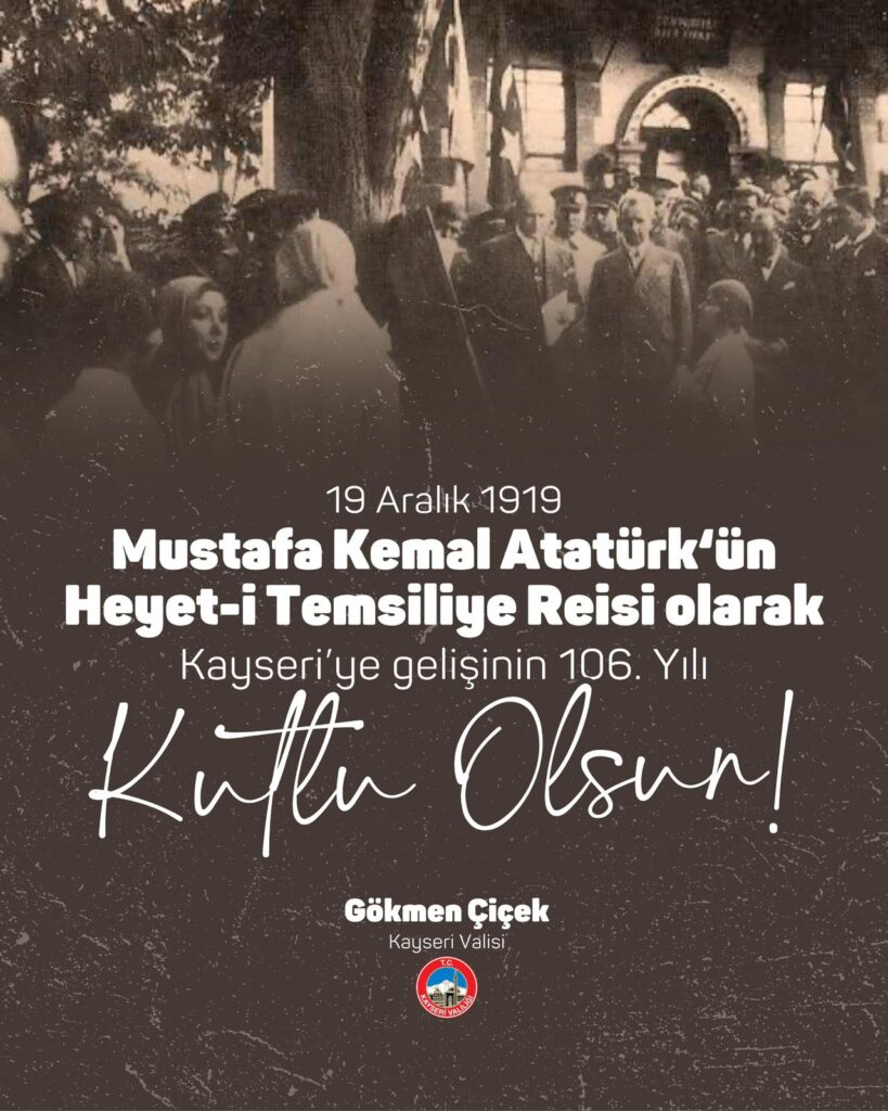 Vali Gökmen Çiçek, Cumhuriyetin kurucusu Gazi Mustafa Kemal Atatürk’ün Heyet-i Temsiliye Reisi olarak Kayseri’ye gelişinin 106’ncı yıl dönümü dolayısıyla sosyal medya hesabından bir kutlama mesajı yayımladı.