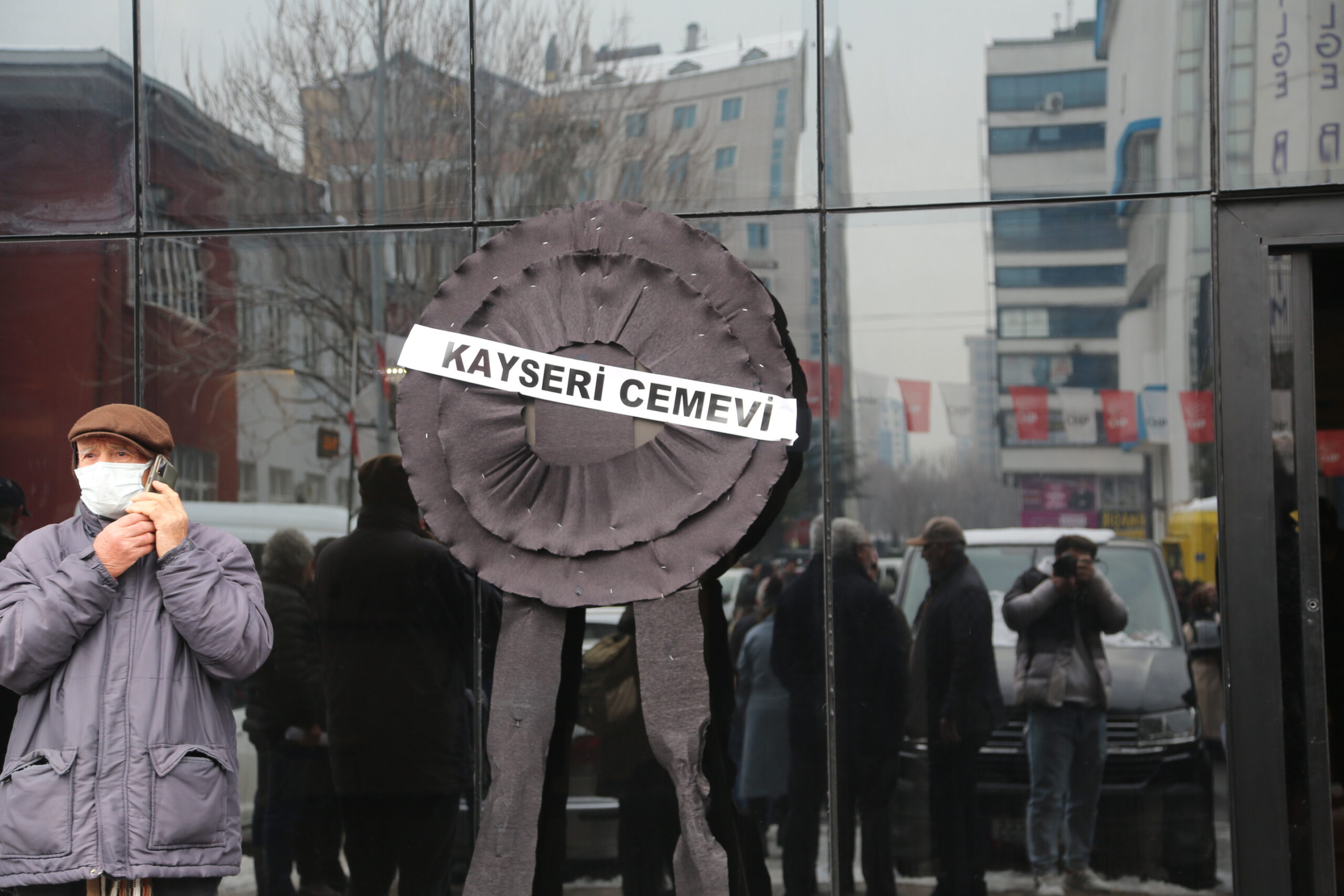 Hacıbektaş Kültür Derneği Kayseri Şubesi öncülüğündeki 13 alevi derneği, CHP İl Binası önüne siyah çelenk bıraktı.