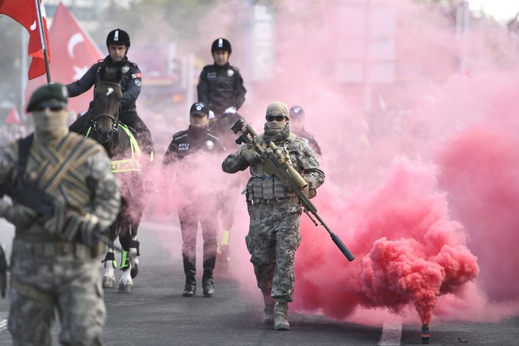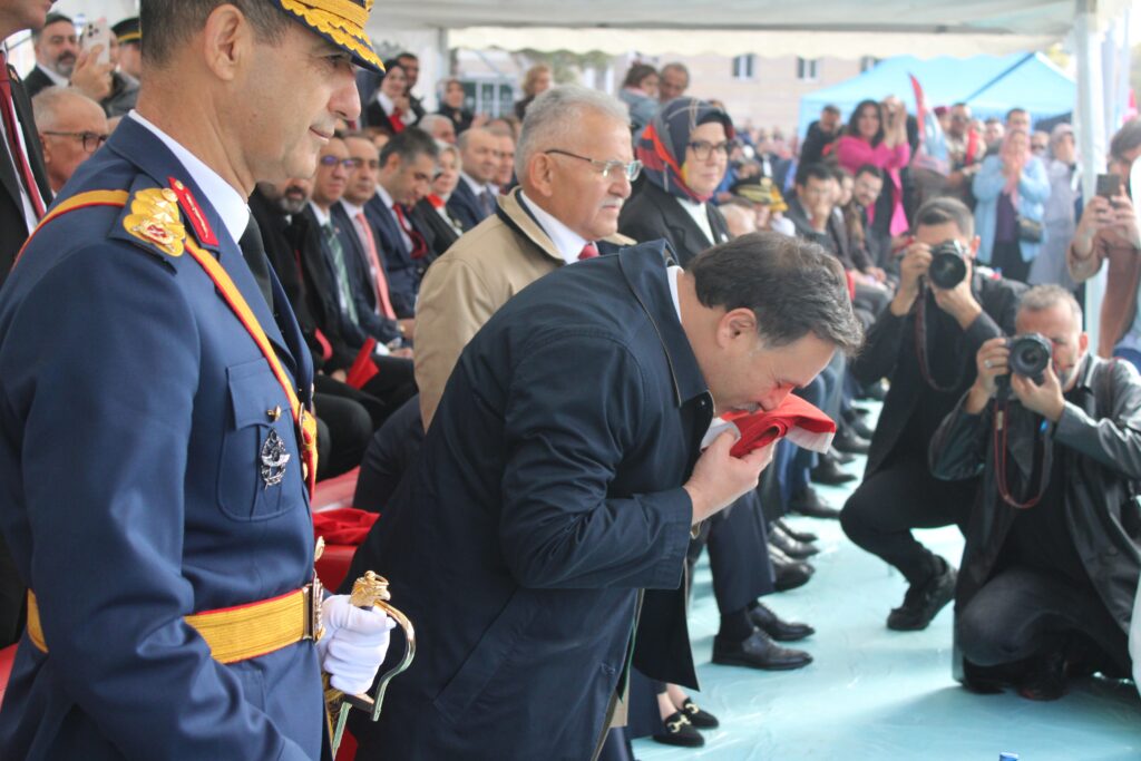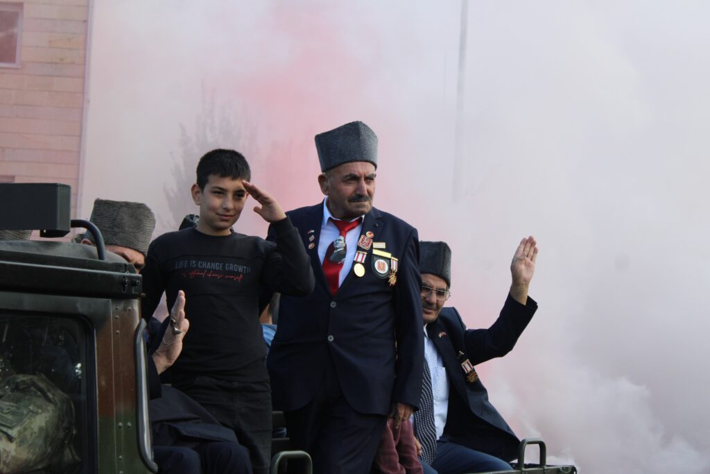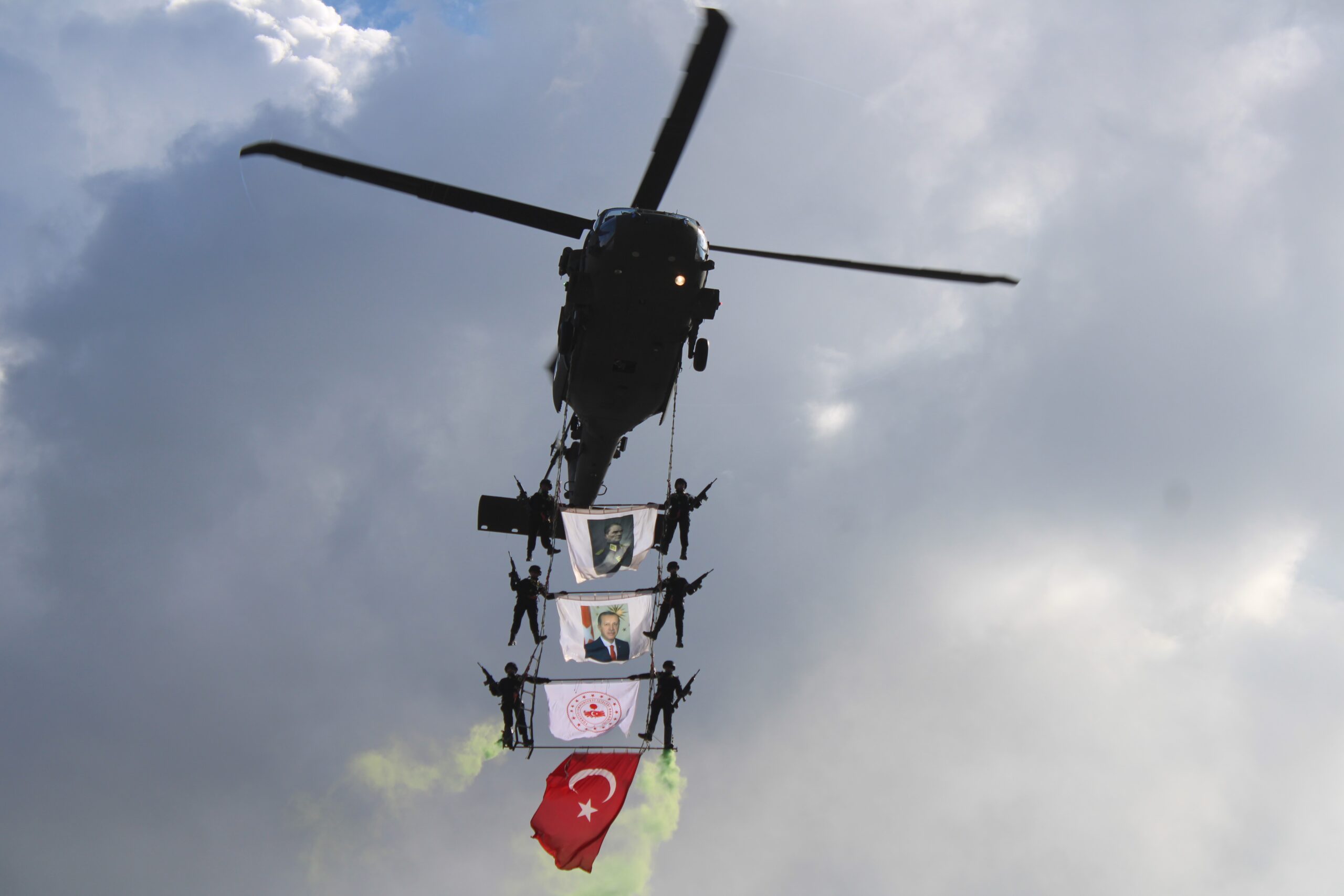 Öte yandan konuşmaların ardından düzenlenen kortejde ise Jandarma Genel Komutanlığı’na bağlı ‘Çelik Kanatlar’ ekibi tarafından vatandaşlara üzüm salkımı gösterisi yapıldı. Gösteride, askerler helikopterden halatlar ile sarkarak halkın üzerinden uçuş yaptı.