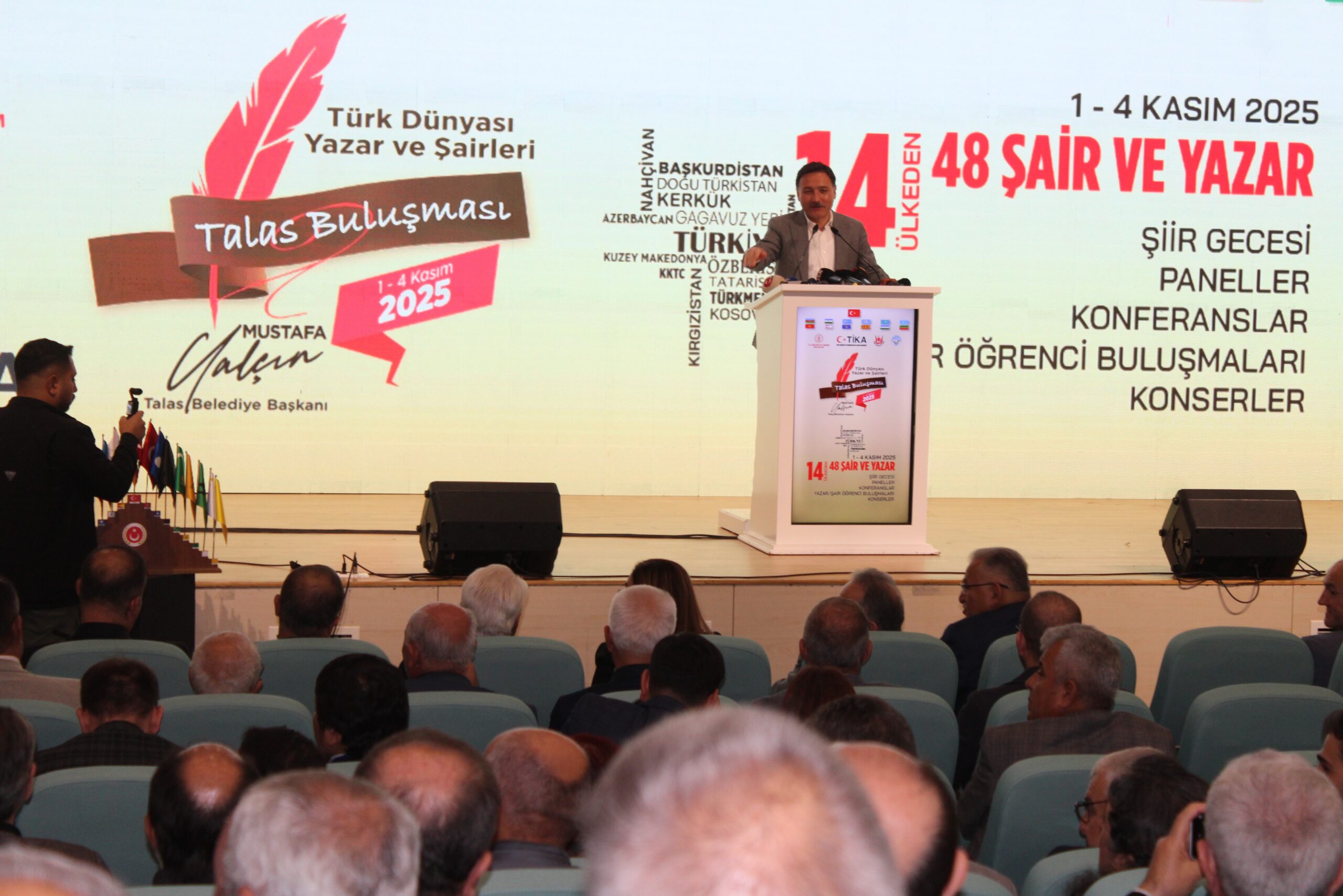 Kültür ve Turizm Bakanlığı, TİKA ve Türk Edebiyatı Vakfı Destekleriyle Talas Belediyesi’nin ev sahipliğinde ‘Türk Dünyası Yazar ve Şairler Talas Buluşması’ düzenlendi. Erciyes Kültür Merkezi’nde düzenlenen programın açılış konuşmasını yapan Talas Belediye Başkanı Mustafa Yalçın, Türk coğrafyasından gelen kalem ve söz ustalarıyla birlikte olmanın onurunu yaşadıklarını ifade ederek; “Amacımız; yeni gönül köprülerimizi perçinlemek ve yeni ilham pınarı açmaktır. 90’lı yıllardan itibaren Türk Devletleri ile aramızdaki iktisadi, siyasi ve askeri ilişkiler gün geçtikçe derinleşmiş, güçlenmiş ve tüm ülkeleri birbirlerine daha çok yaklaştırmıştır. Dünyanın yeni bir dönemden geçtiği, sınırların yeniden şekillendiği, yeni ittifakların kurulduğu bu dönemde Türk Devletleri’nin liderleri; tarihi konulara yüklediği büyük sorumlulukla büyük ve müreffeh vatanımızın çatısı olan Türk Devletleri Teşkilatı’nı kurmuşlardır. Cumhurbaşkanımız Recep Tayyip Erdoğan’ın öncülüğünde diğer ülkelerimizin liderlerinin de gayretleriyle kurulan bu teşkilat; yüzlerce yıllık rüyalarımızın gerçeğe dönüşmesidir. Türk Dünyası; aynı kökten beslenen ama farklı dallarda yeşeren bir ulu çınardır. Azerbaycan’dan Kazakistan’a, Kırgızistan’dan Türkmenistan’a, Özbekistan’dan Kuzey Kıbrıs’a, Balkanlar’dan Anadolu’ya kadar aynı duyguların, aynı hikayelerin, aynı ezgilerin yankılandığı bir gönül birliğine sahibiz. Bu coğrafyadan gelen kalem ve kelam ustalarıyla birlikte olmanın onurunu taşıyoruz” dedi. Türk Edebiyat Vakfı Başkanı Serhat Kabaklı da Türk Dünyası’nın Müslüman Dünyası’na da hizmet ettiğini ifade ederek, “300 milyonluk bir Türk Dünyası var ve bu Türk Dünyası’nın yüzde 83’ü Müslüman. Bir o kadar Arap Dünyası var, bunların yüzde 69’u Müslüman. Biz Türk Dünyası’na hizmet ederken aynı zamanda Müslüman Dünyası’na hizmet ediyoruz. Hiç kimsenin gözünden kaçmaması gereken mesele şudur; edebiyat, şiir asla politize olmaz. Ama gönül olarak baktığımızda vahşetin, soykırımın devam ettiği Gazze Müslümanlarına destek ve İsrail’e karşı en büyük tepkiyi ortaya koyan Türk Milleti’dir, Türk Devleti’dir, Türk vicdanıdır” şeklinde konuştu. Yazarlar adına konuşma yapan Doç. Dr. Pervin Nur Aliyeva ise; “Türk Dünyası’nın çeşitli yerlerinden gelmiş söz, edebiyat, şiir adamlarıyla konuştuk. Yeni konuşmalar, yeni tanışmalar, yeni bağlarımız kuruldu. Bugün bir daha anladım ki; insanları farklı değerler birleştirebilir ama insanları söz birleştirince daha sağlam, daha değerli bir bağa çevrilebilir. Bu buluşmaya çaba veren herkese teşekkür ederim” ifadelerini kullandı.