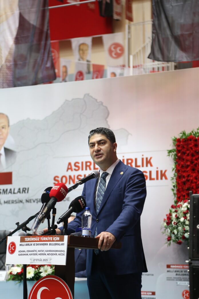 Türkiye’nin 21. yüzyılın başından itibaren ciddi tehditlerle karşı karşıya kaldığını vurgulayan Özdemir, “Türkiye’ye yönelen tehdit ve tehlikelerin nasıl bir boyut kazandığı ve buna mukabil gelinen aşamada hangi seviyede olduğumuz ve özellikle MHP olarak yirmi birinci yüzyılın ilk çeyreğinde Liderimiz Devlet Bahçeli’nin izinde hangi adımları attığımızın iyi anlaşılması gerekir. Yeni yüzyılın henüz başlarında ülkemiz yoğun bir terör tehdidi ve ardından gelen Irak’ın işgali ile başlayan, Ortadoğu’da sınırların değiştirilmeye çalışıldığı habis kurgularla yüzleşmek durumunda kalmıştır. Aynı süreç Türkiye’nin, emperyal hesaplara kurban edilmeye çalışıldığını komşu ülkelerimizde yaşanan işgalleri takip eden, planlı ekonomik taarruzlarla vatandaşımızın imkanlarının kısıtlandığı, devletimizin gücünün çökertilmesinin hedeflendiği ve her anlamda istikrarsızlığın Anadolu coğrafyasını etki altına almaya uğraşıldığı koşulları karşımıza getirmiştir. Ardından takip eden yıllarda ise Ortadoğu ve Kuzey Afrika ülkelerinin tamamını etkileyen, rejimlerin çöktüğü, yönetimlerin dış müdahalelerle el değiştirdiği, iç savaş şartlarının vasat bulmasıyla yeni sınırların belirlenmeye çalışıldığı bir aşamaya geçilmiştir. Bu dönemde bahse konu olan yakın coğrafyamızda tabir yerindeyse oluk oluk kan akmış, mazlum ve mağdurların tamamı Müslümanlar olmuştur. Bu şartlar altında ülkemize yönelen tehdit ve tehlikeler boyut ve derinlik kazanarak artarken, hesaplaşmanın ilk aşaması 15 Temmuz 2016’da FETÖ eliyle gerçekleşen darbe girişiminde yaşanmıştır” diye konuştu.