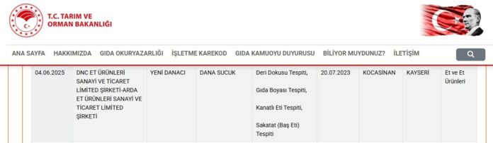 Bakanlığın resmi sitesinde yayınlanan listede yer alan DNC Et Ürünleri Sanayi ve Ticaret Limited Şirketi – Arda Et Ürünleri Sanayi ve Ticaret Limited Şirketi firma sucuğunda deri dokusu, gıda boyası kanatlı et tespiti ve sakatat (baş) eti tespit edildiği bildirildi.
