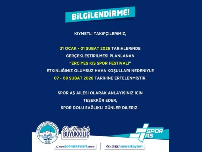 Erciyes’te 31 Ocak-1 Şubat tarihlerinde yapılması planlanan Erciyes Kış Spor Festivali, olumsuz hava koşulları nedeniyle ertelendiği açıklandı. Spor A.Ş. tarafından yapılan açıklamada, etkinliğin 7–8 Şubat tarihlerinde gerçekleştirileceği bildirildi. Açıklamada, hava şartlarının etkinliğin sağlıklı ve güvenli şekilde yapılmasına elverişli olmaması nedeniyle erteleme kararı alındığı ifade edildi.